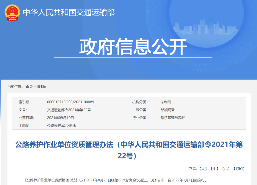 交通运输部发布《公路养护作业单位资质管理办法》,2022年1月1日起施行。明确了各类建企(公路养护作业单位)申请资质 对建造师人员配置数量要求。 公路养护作业单位资质分为 路基路面、桥梁、隧道、交通安全设施养护 四个序列 。 路基路面、桥梁、隧道养护资质 下设 甲、乙两个等级 ,交通安全设施养护资质 不分等级 。 《办法》新增并明确了对 建造师、职称人员、技术工人、造价工程师人数 的需求。