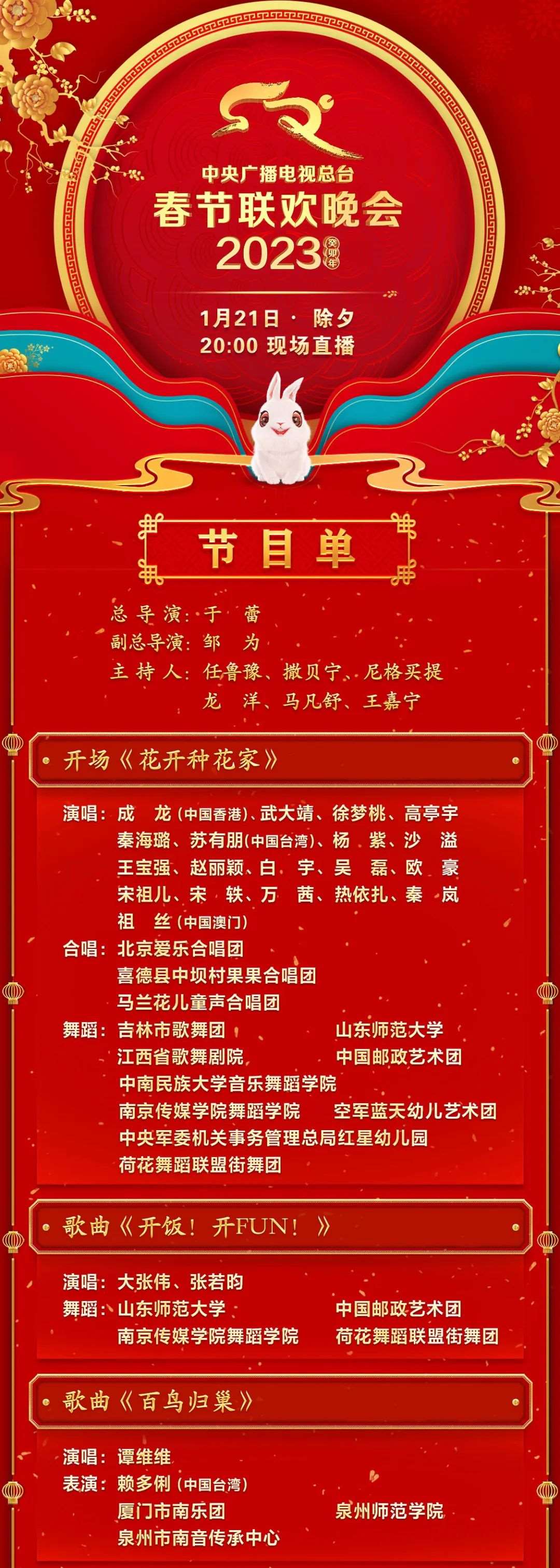 兔年春节来临之际 中央广播电视总台 《2023年春节联欢晚会》 节目单正式发布↓